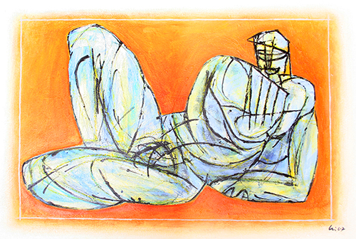 In my paintings the archaic figure of Pan stands for life on earth in accord with an intact nature. That’s why I have portrayed him in the light colours of clear water, clean air and springing up plants. Cheerfully and relaxed, he rests on the warm and fertile ground playing his pipes. He is surrounded by an inconspicuous silvery grey rectangle.