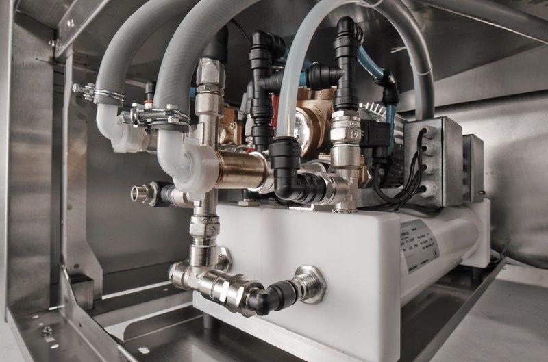 The free-standing reverse osmosis system is suitable for installation next to the dishwasher. Minerals and salts are completely removed from the water. This prevents salt and limescale stains on dishes, glassware and cutlery and optimises the wash result.